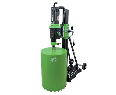 The EBM 352/3 (20 Amp 3-speed motor when combined with an anchor/vacuum stand) drills holes up to 14" diameter in concrete, reinforced concrete, asphalt and natural stone. The motor can also be mounted on a variety of drill rigs. No other Diamond Core Drill Rig in this class is so light and portable, weighing only 77 lbs. The drill stand has two 5" wheels for easy portability.