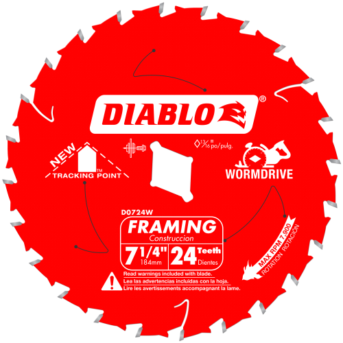 Next generation 7-1/4” 24T Framing Blade with Tracking Point™ Tooth design delivers maximum life and durability with effortless cutting performance. Up Your Cutting Game with this one-of-a-kind Tracking Point™ tooth grind for unmatched cutting performance and efficiency. This is the only 7-1/4” blade on the market to include Tracking Point™ Tooth design; making it is ideal for framers, roofers, remodelers, concrete formers or anyone wanting ultimate cutting performance in pressure treated wood, 2x lumber, plywood, hardwoods & softwoods. With 5 times the cutting life performance compared to other framing blades, you can save up to $29.00.