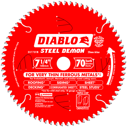 Steel Demon saw blades are specially designed for the extreme demands of ferrous metal cutting; thereby enabling precise cuts without sparks, heat or burred edges that result from using abrasive blades. With up to 40X the life of standard abrasive disc, Steel demon delivers unparalleled performance and superior quality cuts. Blades feature Freud's TiCo Hi-Density Carbide, Laser cut bodies, Anti-vibration technology, Perma-Shield Non-Stick Coating, Triple Chip Design, and pretensioned blades. Diablo's blade is designed to fit Evolution , Jancy , Morse , and Similar Metal Cutting Saws. 7-Inch/18mm diameter x 7t, 2mm arbor, 39+ RPM, 18 ga or thinner max cut thickness, general purpose steel.